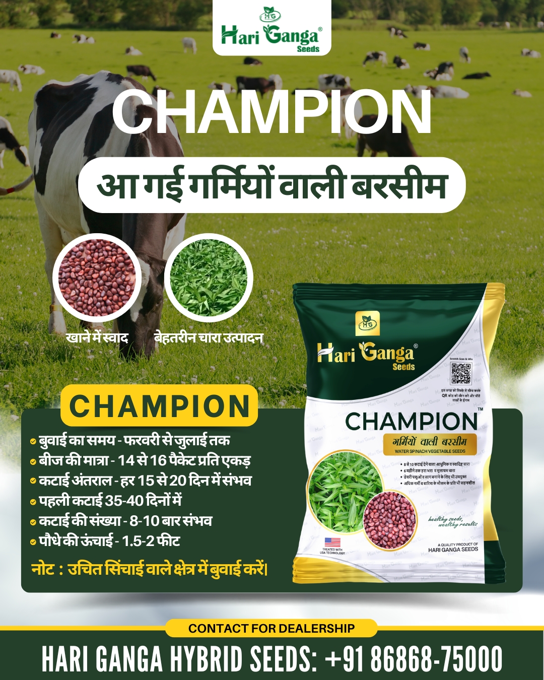 हरी गंगा चैंपियन (गर्मियों वाली बरसीम) एक लंबी अवधि और बहु-कटाई क्षमता वाली बरसीम की किस्म है, जिसे फरवरी से जुलाई के महीने तक लगाया जा सकता है। यह बरसीम पशु-चारे के लिए वरदान है। इस किस्म की 8-10 कटाई 6 महीने तक हरा चारा देने में सक्षम है।